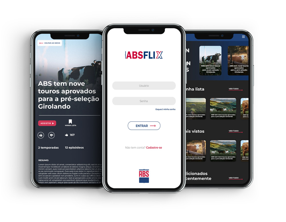 A ABS é a maior e mais completa empresa do mercado de genética bovina. Realizamos o planejamento e criação do app ABS Flix em Android e IOS para uso exclusivo dos colaboradores da empresa.